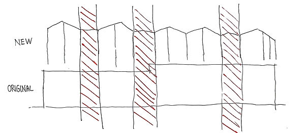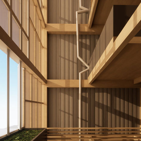 Because the apartments only have windows on one side, the light colored ceilings are slanted and dropped to reflect more light into the space as well as hide mechanical systems. Inside each apartment, radiant flooring systems heat the space. The structure of the addition focuses on mass timber to create a more renewable and lighter addition, and its structural layout follows the existing structural grid of the existing Whitlock building. The new construction makes use of fins extruded from the house-like geometry and zig zagging balconies that create a sun shading system, providing full shade in the summer while allowing the winter sun to enter the space. The railings on the balcony are also functional and serve as additional sun shading systems.